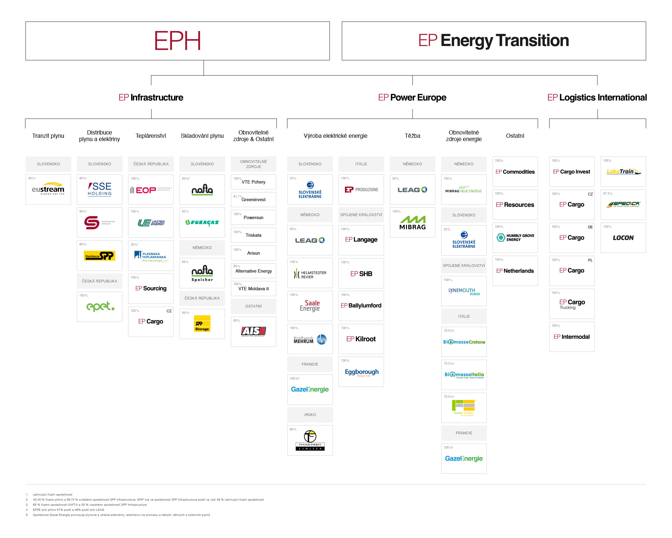 Skupinu EPH tvoří více než 70 společností strukturovaných do tří pilířů – EP Infrastructure, EP Power Europe a EP Logistics International.